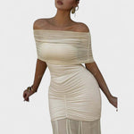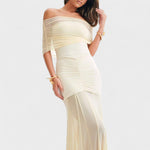 Тази дълга рокля от трико е ода на елегантната чувственост. С открити рамена и тесен крой, тя перфектно се адаптира към тялото, докато прозрачната пола добавя течливост и сложност на всяко движение. Това е идеалният избор за подчертаване на оценени събития с модерен и смел вид.