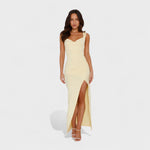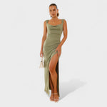 Роклята Констанца прекроява сложността със своето драпирано деколте и открит гръб с панделка. С тясна силуета, която удължава фигурата и страничен разрез за свобода на движение, тя е идеална за отличени събития, на които искате да се блеснете.