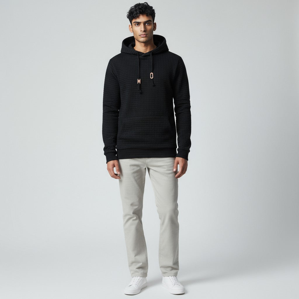 Подчертайте своя ежедневен стил с този удобен костюм, проектиран за перфектно прилягане и максимална универсалност. Неговата уникална текстура и уютната качулка създават задължителна дреха за всеки, който цени както модата, така и комфорта в ежедневието си.