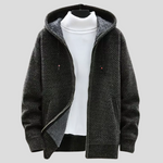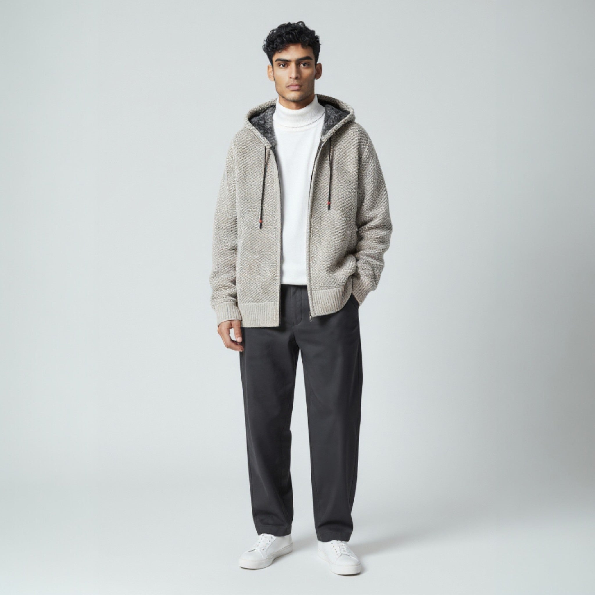 Този пуловер с качулка е перфектната комбинация от комфорт, дишаща материя и безупречен стил. Изработено от едра плетка с изискан десен, то е изключително меко на допир и винаги изглежда елегантно. Вътрешната страна е подплатена с мека "теди" подплата, която прави идеално за най-студените дни.