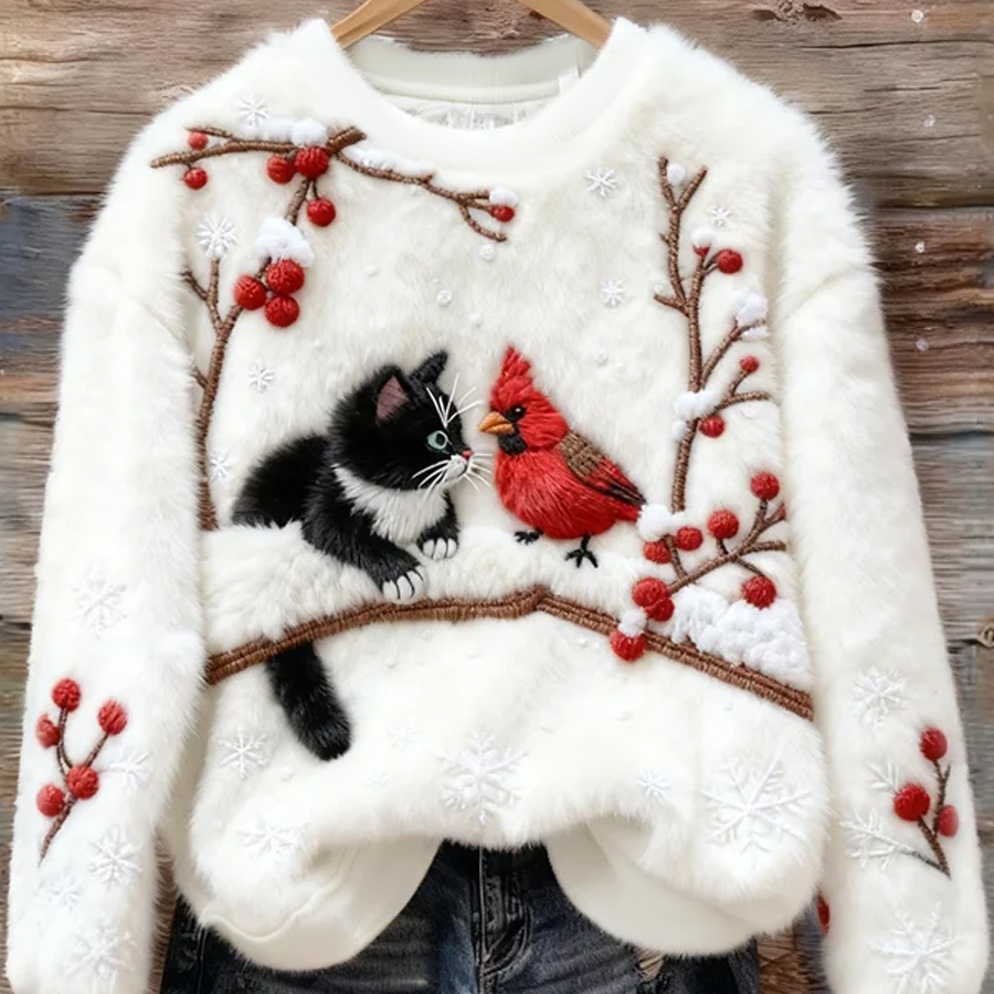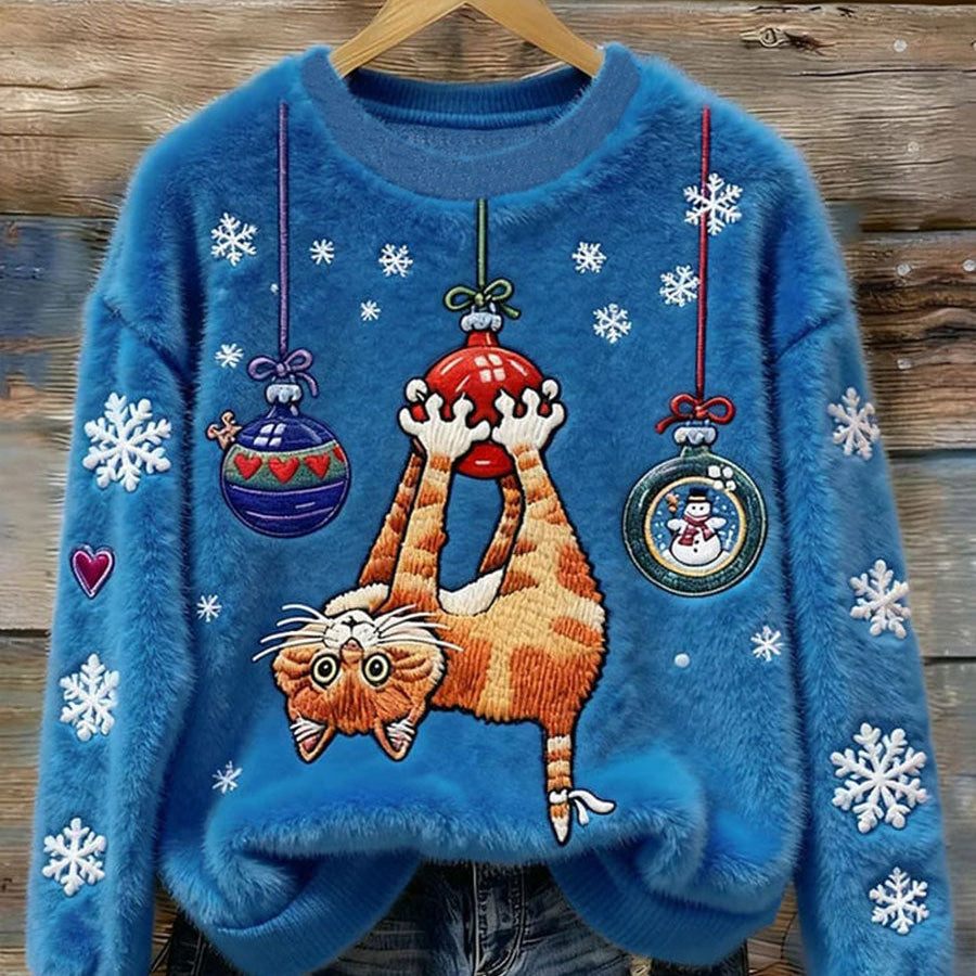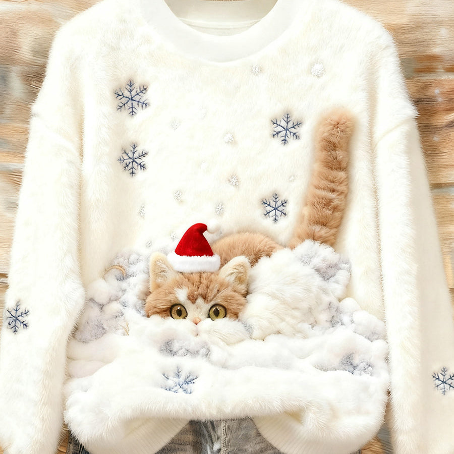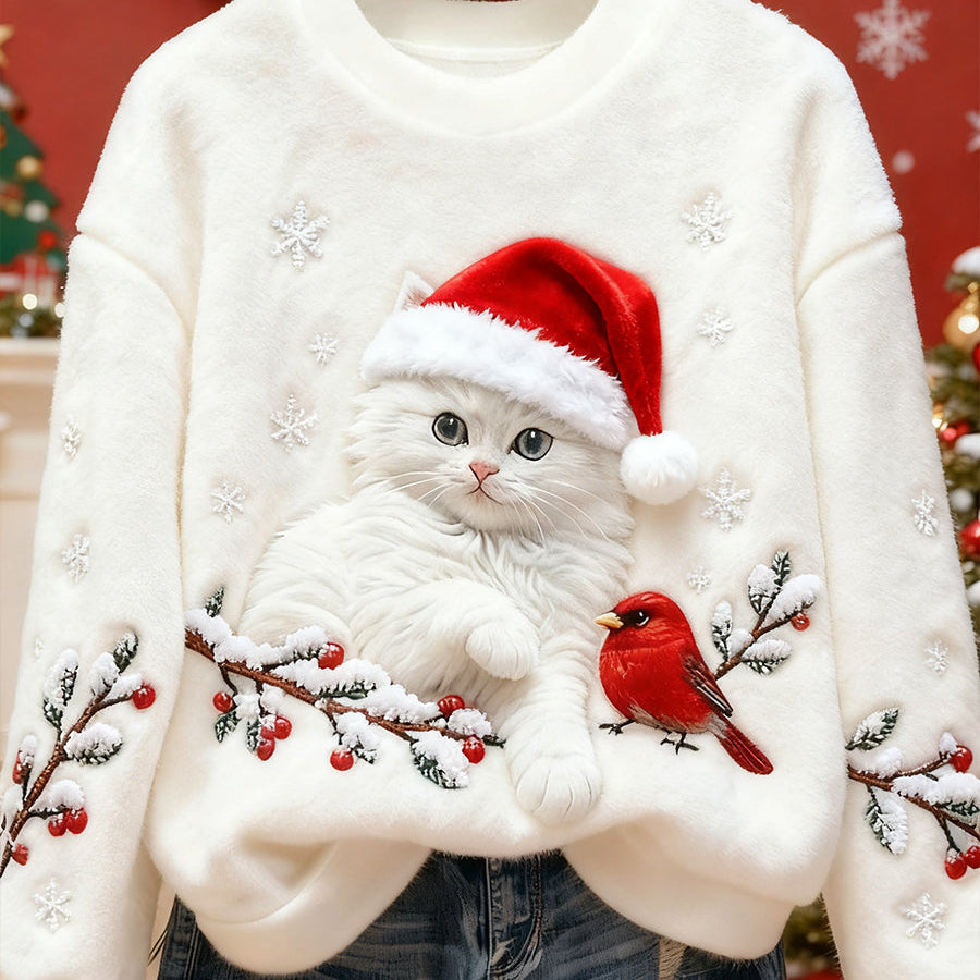 Дамски Сладък Коледен Котешки Арт Печат Удобен Фланелен Свитер