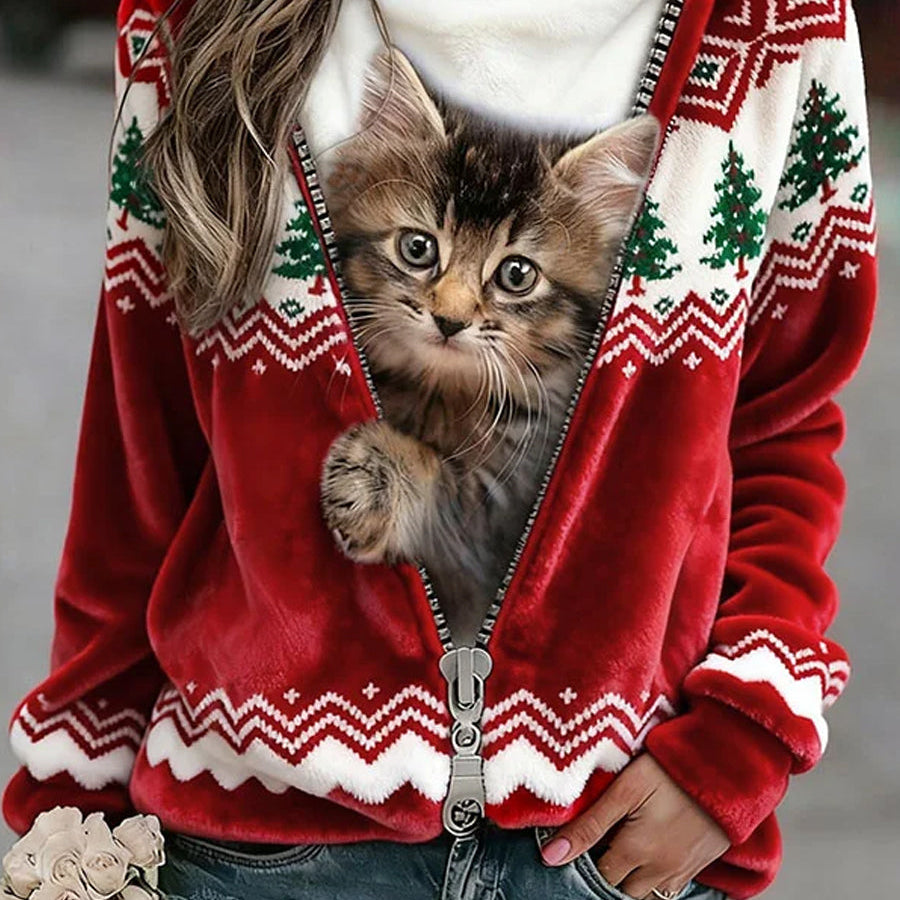 Красив Коледен Котешки Арт Принт за Жени Casual Фланелена Худи