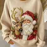 Даме Винтидж Дядо Коледа Свободен Пуловер с Кръгло Деколте