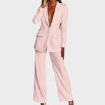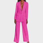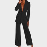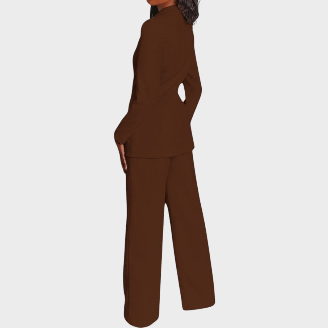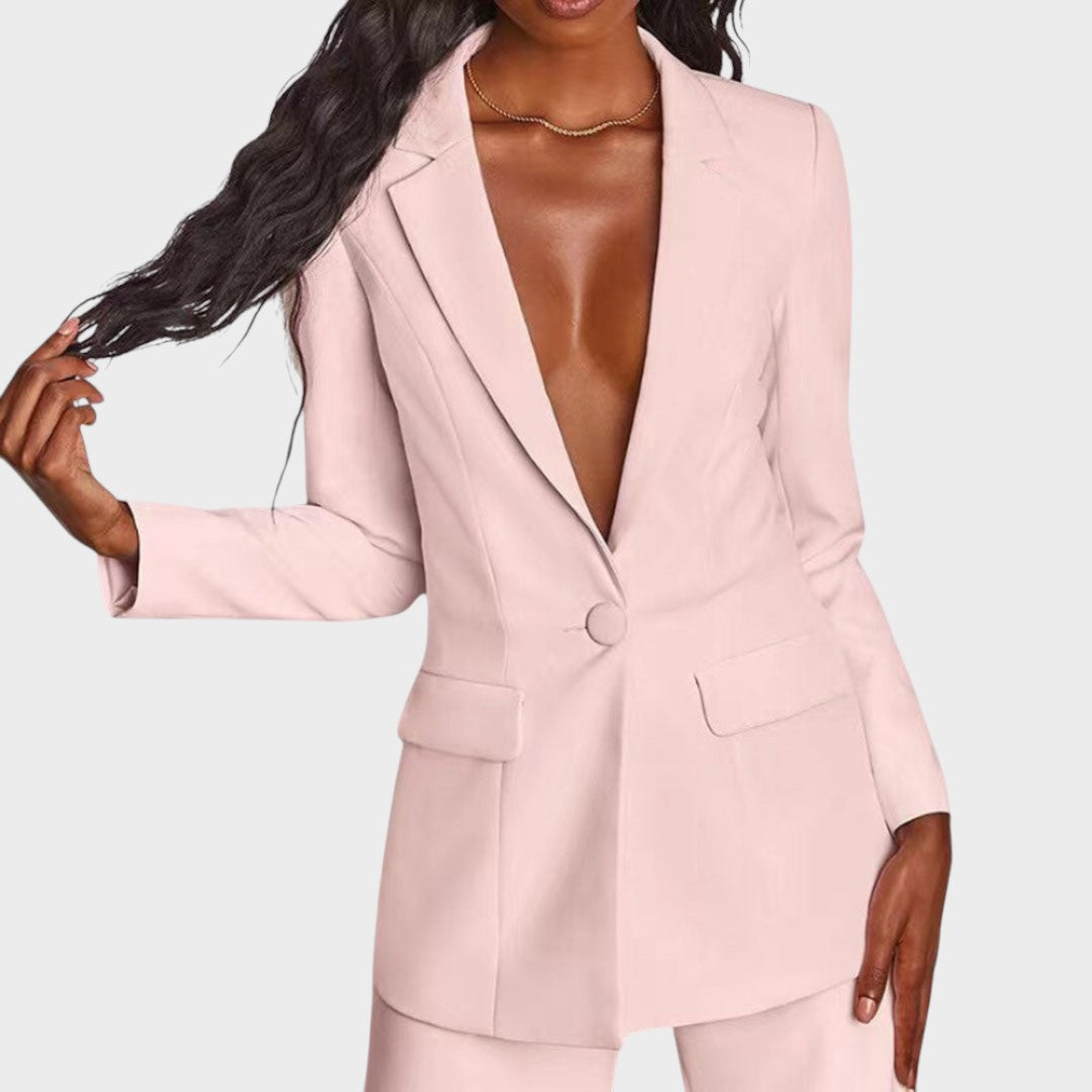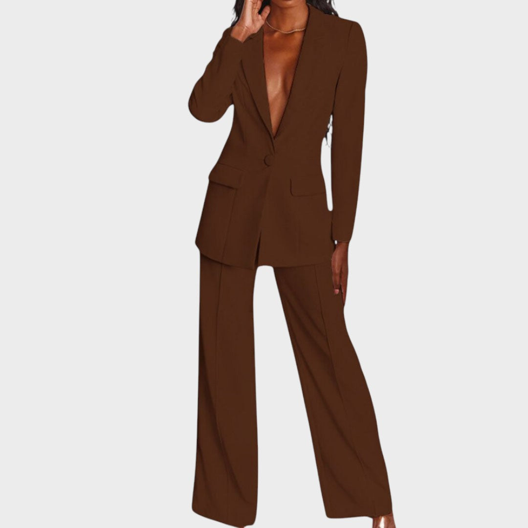 Дамски костюм, който съчетава изтънченост и модерен стил. Дългото сако с остри ревери, закопчаване с един копчета и джобове с капак красиво определя талията и визуално удължава фигурата. Панталоните са прави, с леко широки крачоли и гладка линия, осигуряваща чист, удължен профил и свобода на движение. Тъканта с красиво драпиране предлага комфорт от сутрешната среща до вечерния излаз. Може да се носи като комплект или отделно – едно силно в офиса, на събитие или за официална вечеря.