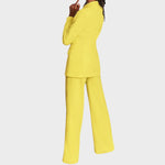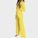 • Ласкава силует: дългото сако, остри ревери и гладка линия на панталоните оптически удължава линията.