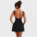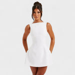 Елегантна безръкава рокля с изискано лодковидно деколте и структурирана горна част нежно подчертава раменете и талията. А-образният силует на полата създава хармонична силуетна линия и осигурява приятна подвижност при ходене и танцуване. Удобната, леко еластична материя следва линията на тялото и запазва безупречен вид от церемонията до вечерното излизане. Идеална за сватби, приеми и всички оценени поводи.