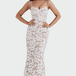 Елегантна макси рокля от Дантела с цветен десен, която подчертава женствеността с елегантност и вечен стил. Тънките презрамки и прилепналият крой обгръщат силуета, правейките са идеални за вечери или високи поводи. Прозрачната текстура на дантелата придава усещане за лукс и романтика.