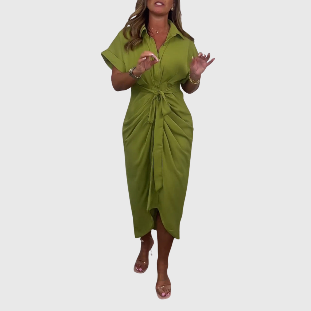 Тази рокля съчетава класическа елегантност и модерен дизайн. Риза-крой с яка и копчета в комбинация с ефектна връзка в талията създава ласкава силуета и подчертава женствеността. Мекият материал осигурява комфорт, а средната дължина прави перфектен избор за бизнес срещи, вечерни излизания или тържествени събития.