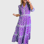 Тази риза-рокля съчетава класика и съвременен дизайн. Благодарение на кроя с яка и копчета, излъчва елегантност, докато впечатляващият десен придава динамичен и модерен вид. С три четвърти ръкави и акцентирана талия, предлага женствен силует и комфорт през целия ден. Идеална за работа, градски разходки или вечерни излизания.