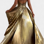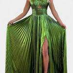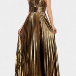 Роклята Бранимира блести с величествено удоволствие благодарение на своя металик материал, преклоп и преден разкрой със стратегически набръчквания. Широката силуета елегантно пада до глезените, създавайки вечно движение с всяка стъпка. Парче, проектирано да се откроява под светлините и да остави следа на всяко събитие.