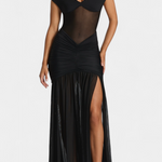 • Изразително V деколте с халтер презрамки, които удължават силуета