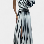 Рокля, която превръща простотата в стилно изявление. Валентина съчетава привлекателността на асиметричния дизайн с една рамка и модел на меки райета, които удължават фигурата и придават динамика. Лека, флуидна и пълна с удоволствие, идеална е за поводи, когато искате да подчертаете елегантността без усилие.