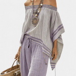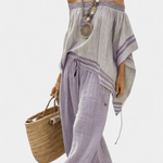 Бамбукова блузка с райета, с открити рамена и широки панталони за елегантен и свеж стил