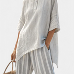 Спокоен стил с модерни линии. Комплект Дейзи комбинира асиметрична блуза с разкроена силуета и райе панталони в неутрален тон, създавайки балансиран, свеж и елегантен вид за топли климатични условия.