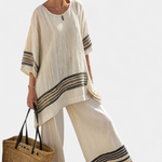 Спокоен стил с вечен морски усет. Комплектът Дейзи привлича вниманието с комбинация от контрастни черни линии и естествен фон, предизвиквайки релаксирана елегантност. Просторната силуета и леката материя правят перфектен спътник за топли климатични условия и бавни дни.