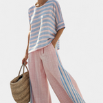 Сладост и лекарството във всяка стъпка. Комплектът Дейзи в нюанси на розово и синьо комбинира топ с вълнообразни линии и широки, проветриви панталони, създавайки свеж и удобен вид, идеален за слънчеви дни на морето.