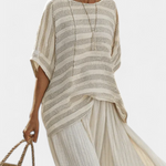 Свободен и с естествен чар, комплектът Дейзи съчетава райета тениска с меко кроене и летящи панталони с широки крачоли. Изработен от ленен бамбук, предлага свежест, нежна текстура и движение, идеален за слънчеви дни на плажа или спокойни разходки от града.
