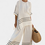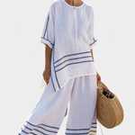 Салопета Дейзи предлага перфектен баланс между удобство и средиземноморски стил. Изработена от лека смес от памук и лен, нейната широка силуета с дискретни отворени елементи и декоративните райета излъчват отпусната свежест.