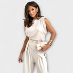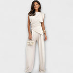 Скулптурна елегантност с модерен привкус: Комплект София комбинира асиметрична блуза с широки панталони за силует, който е елегантен и се движи с грация. Идеален за отличен повод или за да подобрите ежедневието си вид без усилие.