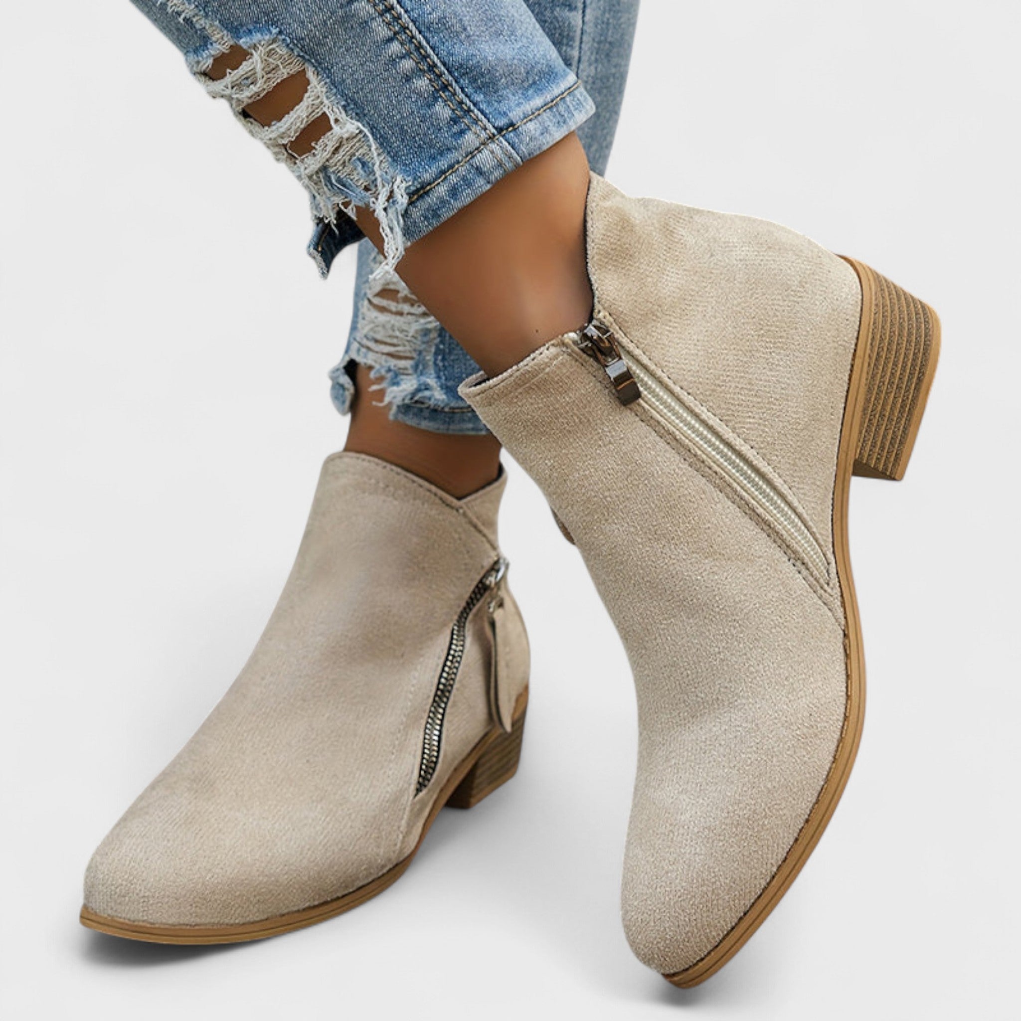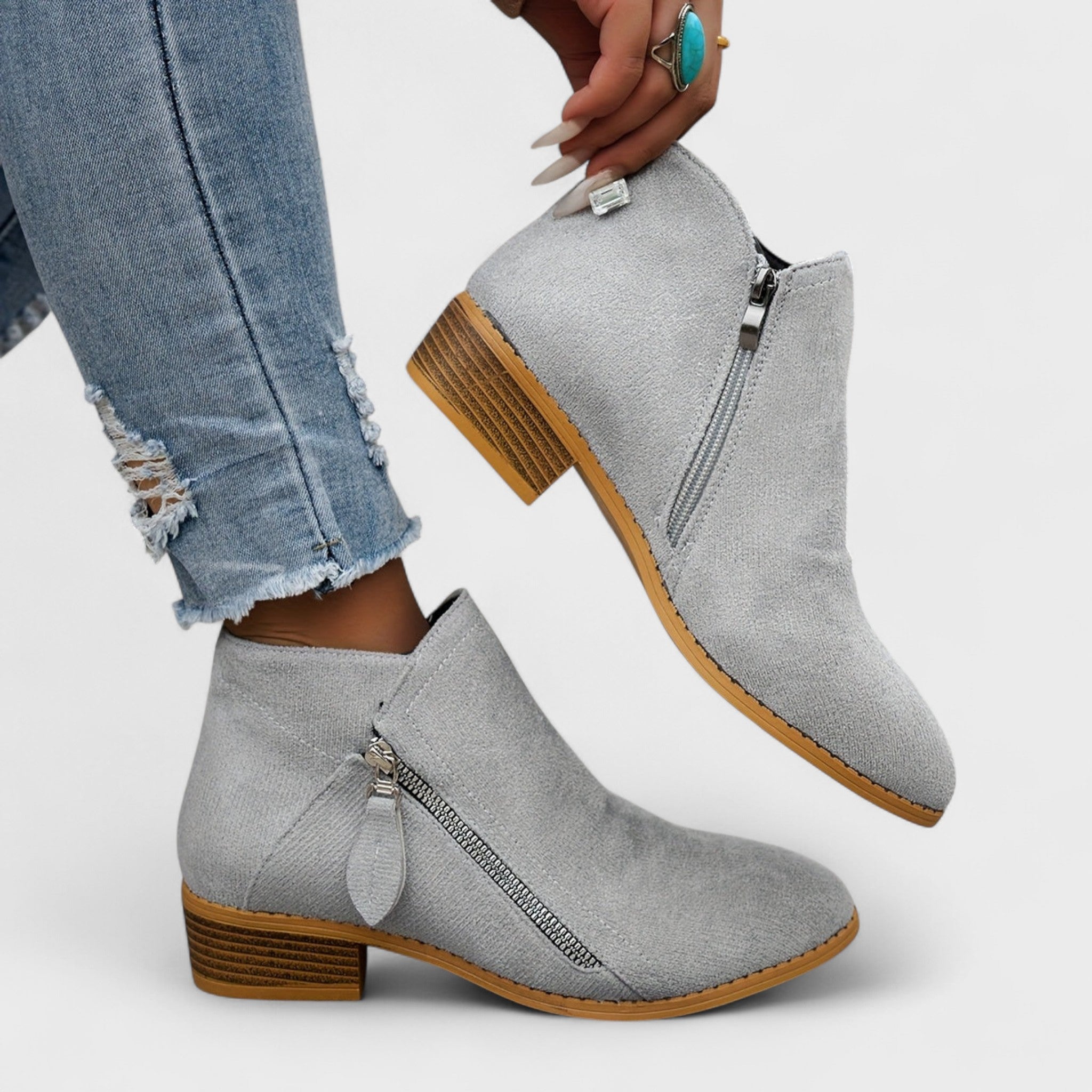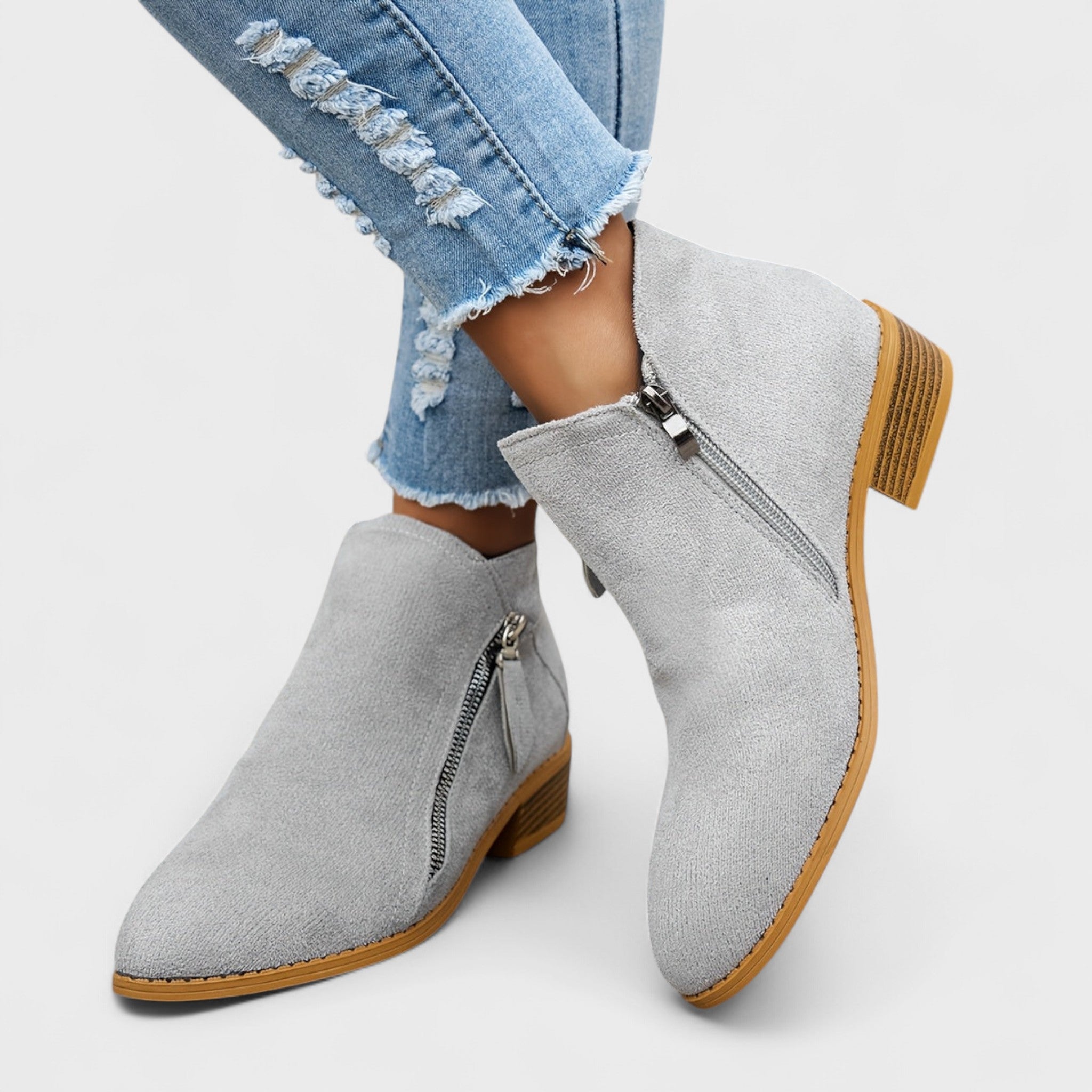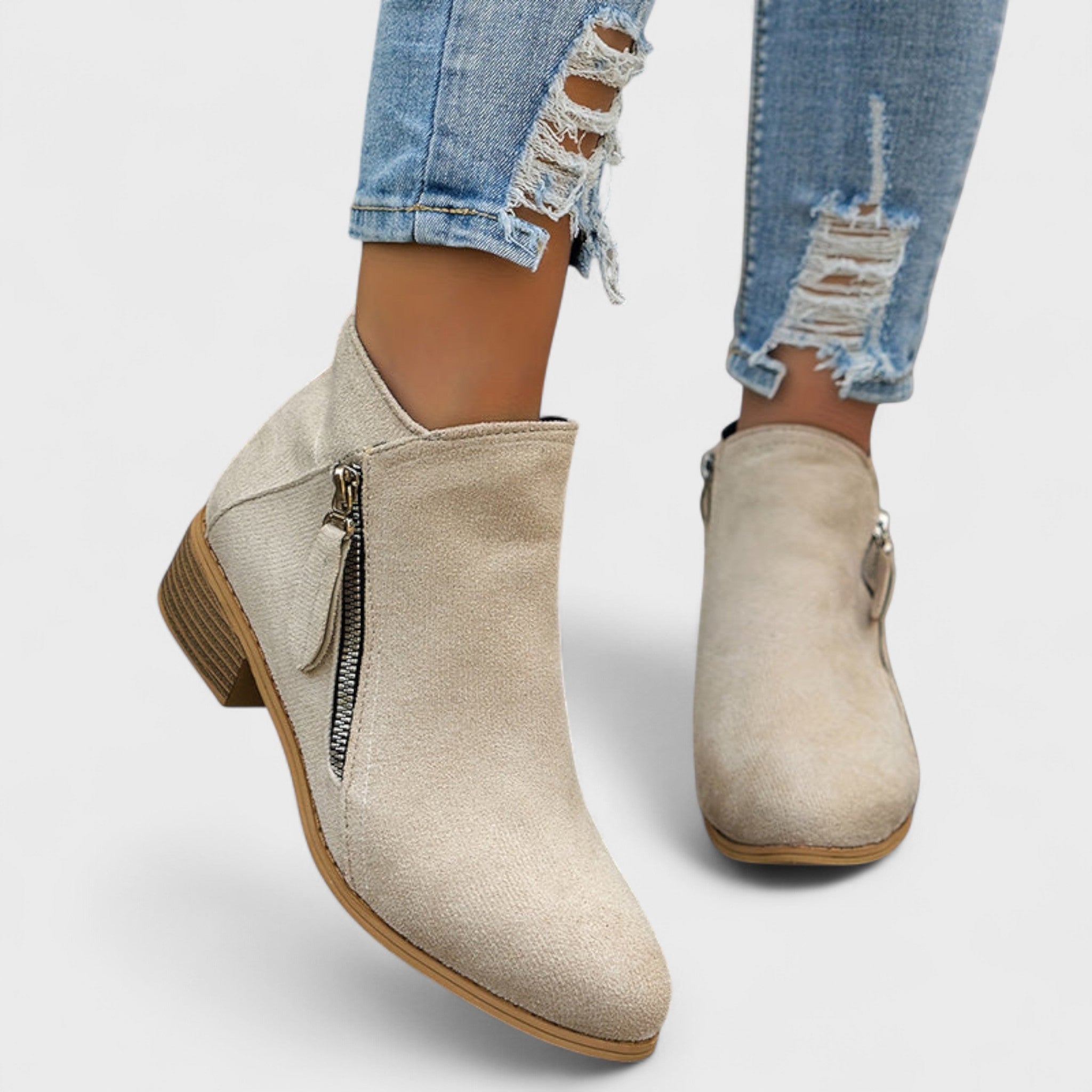 Дамски боти до глезена със страничен цип за бързо обуване и изчистена бадемова предна част. Мек велурен ефект на горната част, стабилен нисък ток и омекотена стелка осигуряват комфорт от сутринта до вечерта. Нехлъзгаща подметка и прецизни шевове за завършен, модерен вид – перфектни към дънки, рокли и офис визии.