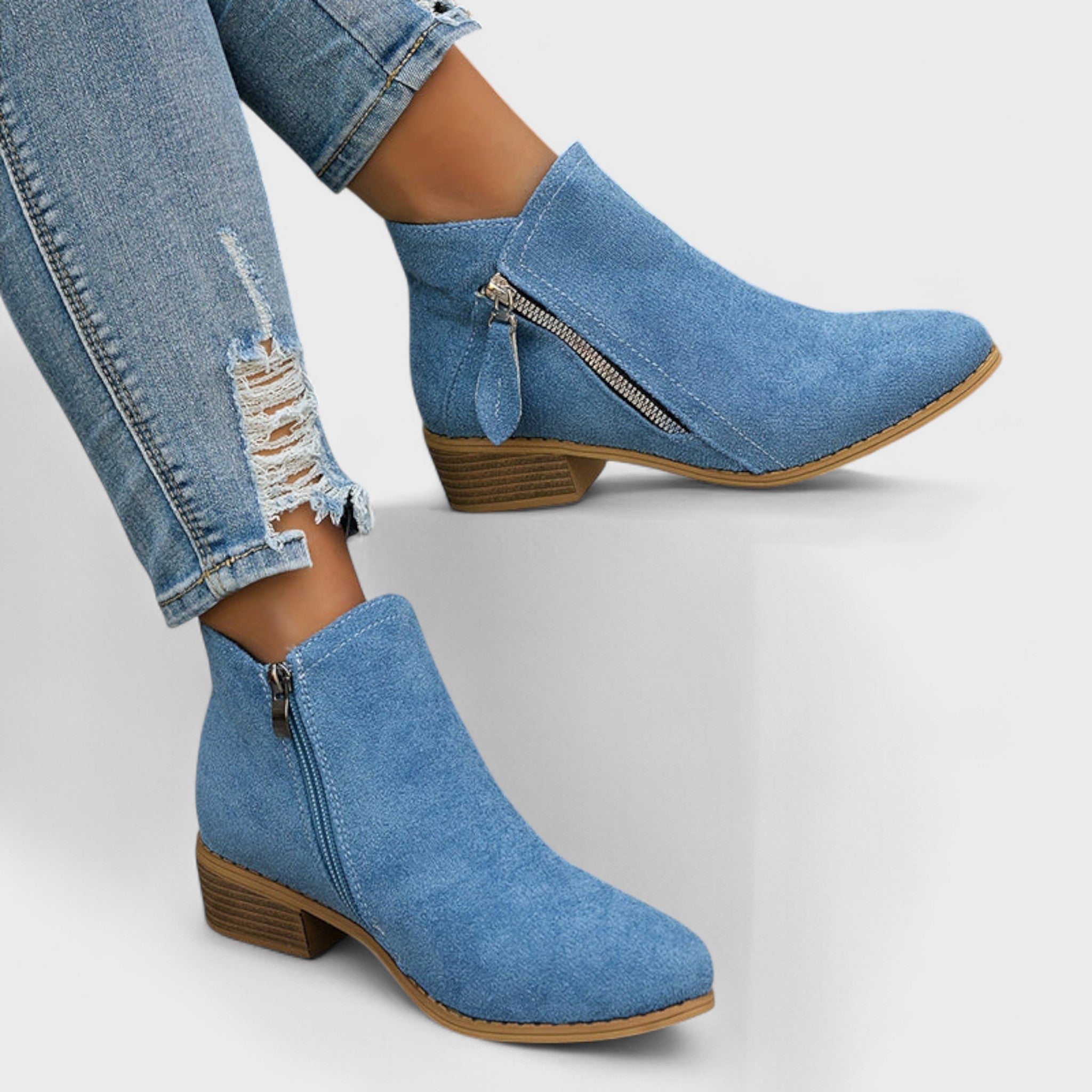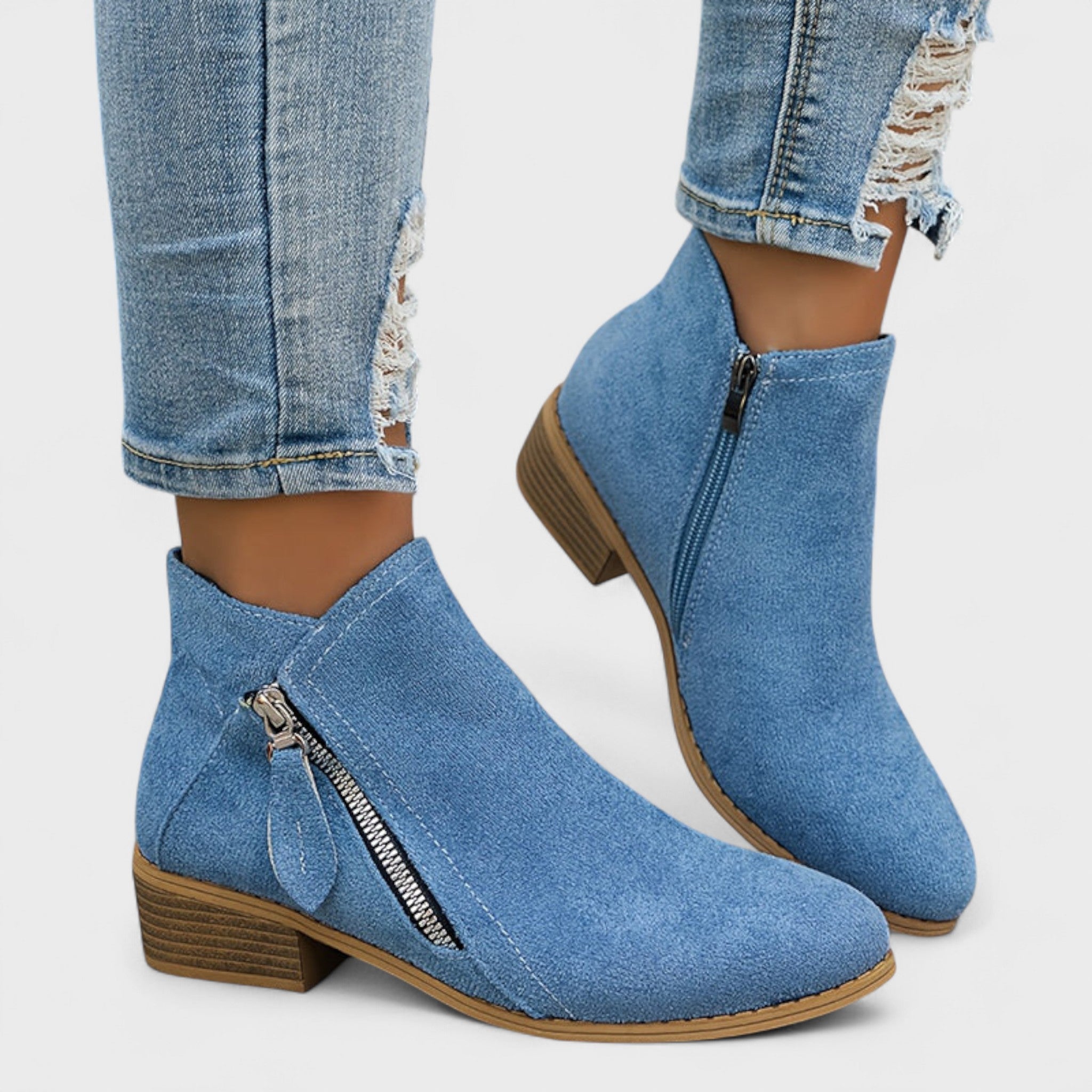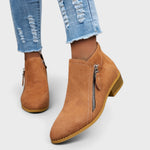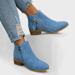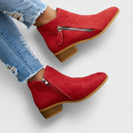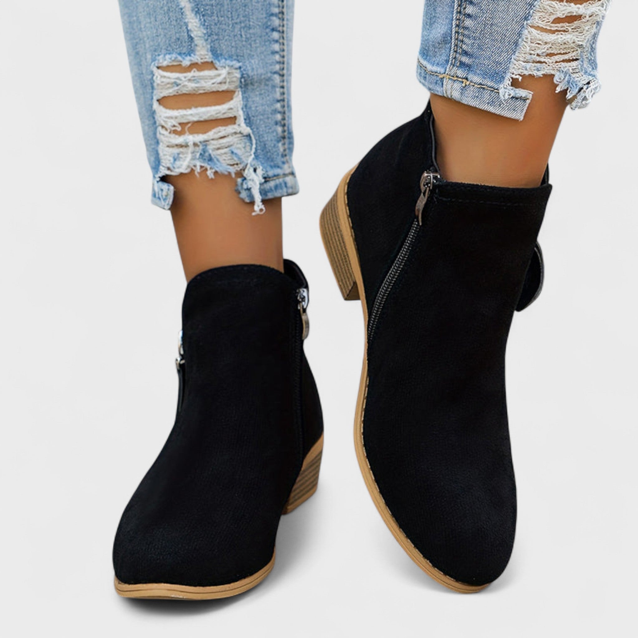 Дамски боти до глезена със страничен цип за бързо обуване и изчистена бадемова предна част. Мек велурен ефект на горната част, стабилен нисък ток и омекотена стелка осигуряват комфорт от сутринта до вечерта. Нехлъзгаща подметка и прецизни шевове за завършен, модерен вид – перфектни към дънки, рокли и офис визии.